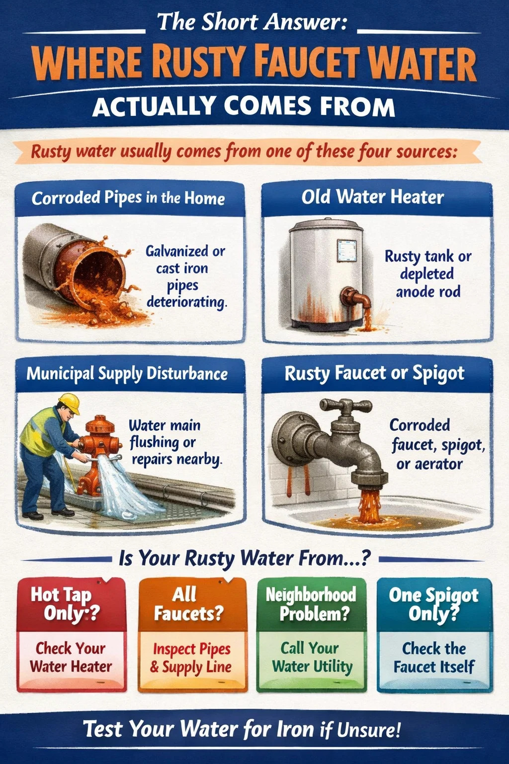 น้ำที่เป็นสนิมจากก๊อกน้ำมักเกิดจากหนึ่งในสี่แหล่งที่มา ได้แก่ เหล็กหรือท่อเหล็กที่สึกกร่อนภายในบ้านของคุณ เครื่องทำน้ำอุ่นที่เสื่อมสภาพ ตะกอนรบกวนในท่อประปาของเทศบาล หรือหัวจุกหรืออุปกรณ์ติดตั้งที่ถูกออกซิไดซ์ ณ จุดจัดส่ง สีส้ม สีน้ำตาล หรือสีแดงที่คุณเห็นคือเหล็กออกไซด์ ซึ่งเป็นสนิม ซึ่งหลุดลอกออกจากภายในท่อและเข้าสู่กระแสน้ำ หรือละลายลงในน้ำโดยตรงขณะเดินทางผ่านโครงสร้างพื้นฐานที่มีอายุมากขึ้น