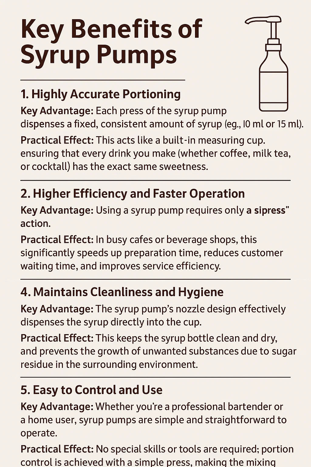ข้อได้เปรียบหลัก: การใช้ปั๊มน้ำเชื่อมต้องการเพียงการ **"กด"** เพียงครั้งเดียว ซึ่งช่วยลดขั้นตอนต่างๆ มากมาย เช่น การเปิดฝาขวด การเท การหาถ้วยตวง จากนั้นปิดฝา
