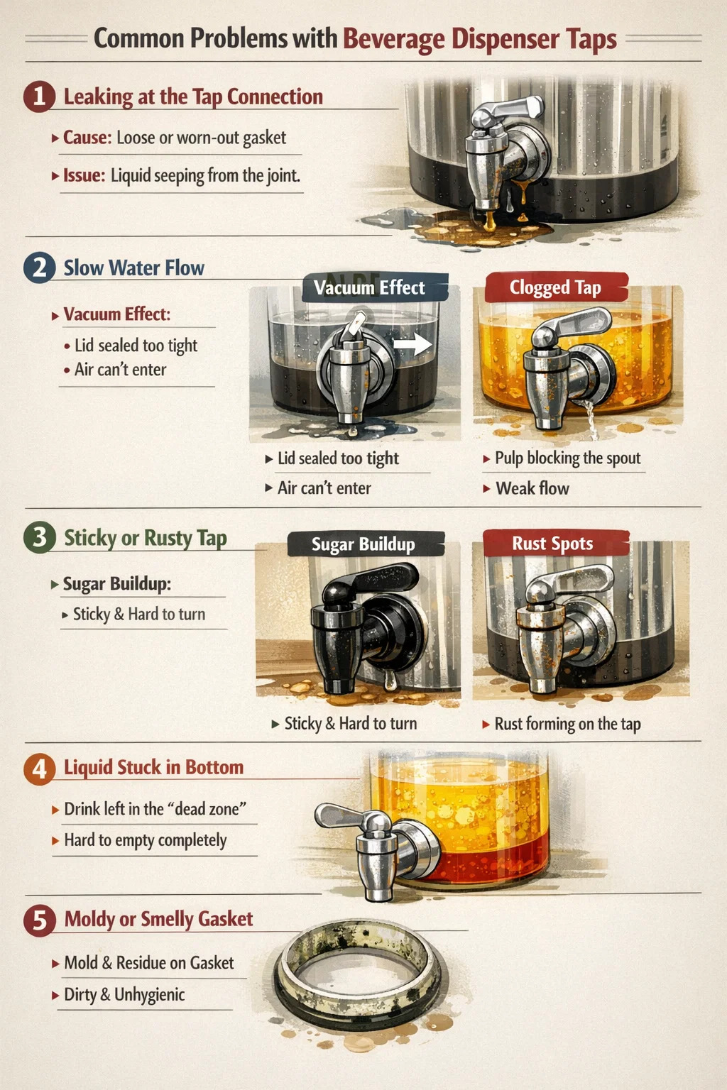 ปัญหาการอุดตัน: หากคุณใช้น้ำมะนาวหรือเครื่องดื่มที่มีเนื้อผลไม้ เศษเนื้อผลไม้อาจติดอยู่ในตัวกรองภายในหรือทางออกของก๊อกจ่ายเครื่องดื่มแบบโลหะ ส่งผลให้น้ำไหลไม่ดี