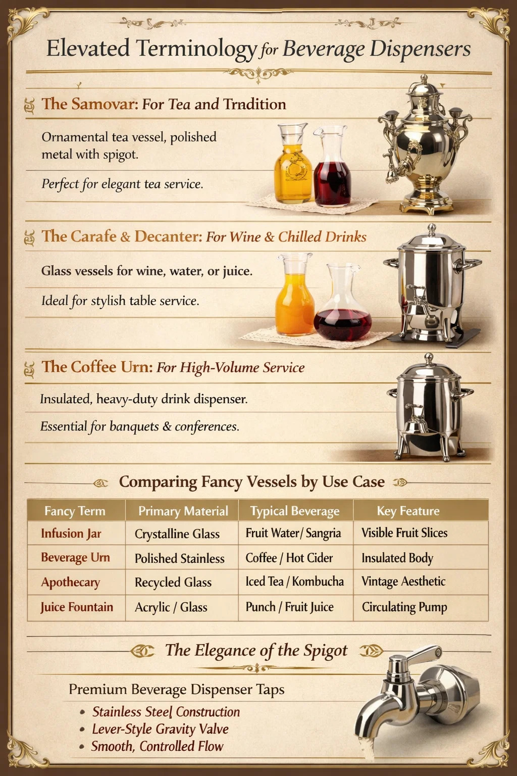 หากคุณกำลังมองหาคำที่สวยงามสำหรับตู้เครื่องดื่ม คำที่ถูกต้องที่สุดนั้นขึ้นอยู่กับการออกแบบและบริบทเฉพาะของภาชนะ สำหรับการสังสรรค์ทางสังคมที่หรูหรา เงื่อนไข "โถ" "ขวดเหล้า" "กาโลหะ" หรือ "โกศ" มีการใช้บ่อย ในการจัดเลี้ยงระดับมืออาชีพและการต้อนรับระดับไฮเอนด์ รายการเหล่านี้มักเรียกกันว่า “น้ำผลไม้คาราเฟ” หรือ "ขวดแช่" แม้ว่าเครื่องมาตรฐานจะใช้งานได้ แต่ในรุ่นหรูก็มีคุณภาพสูง หัวจุกตู้เครื่องดื่ม เปลี่ยนภาชนะธรรมดาให้เป็นอุปกรณ์บริการชิ้นกลาง